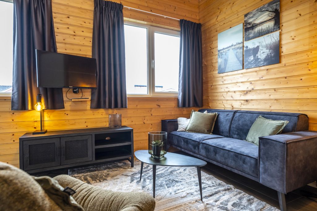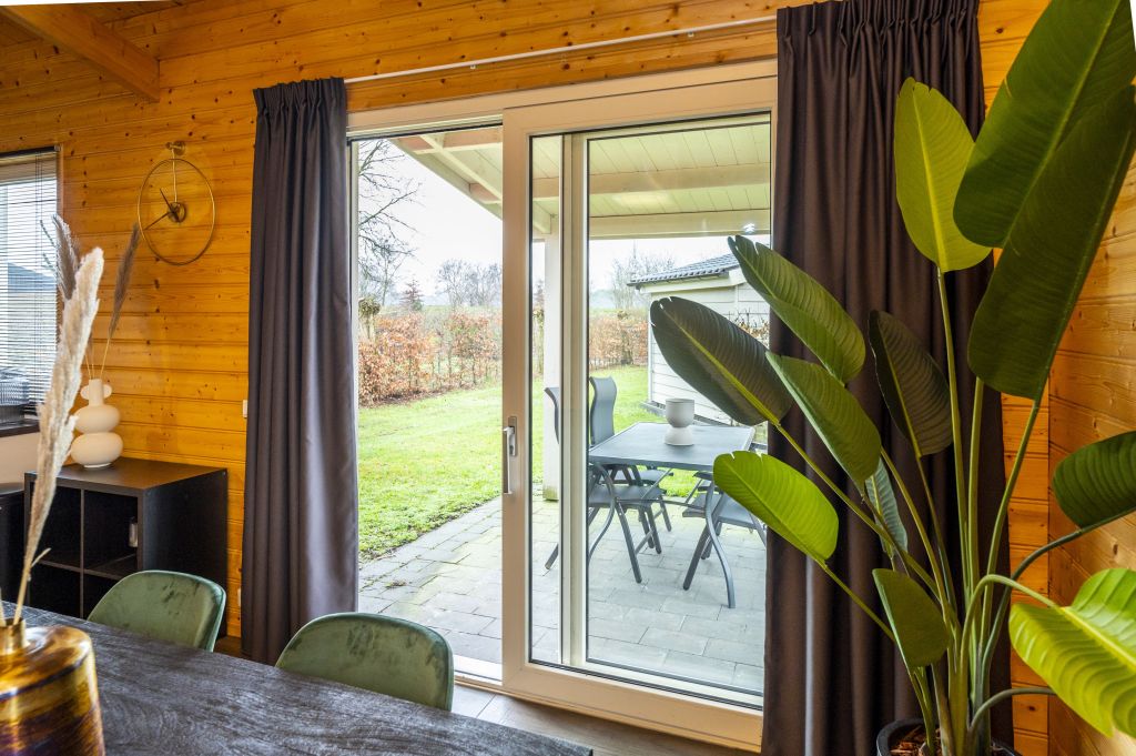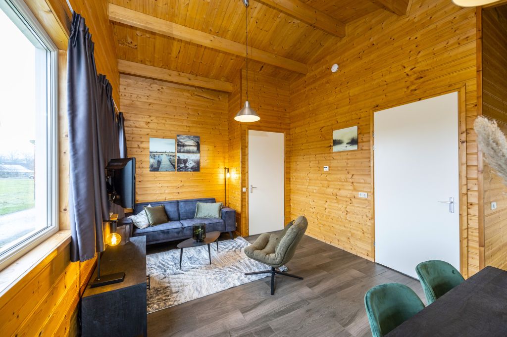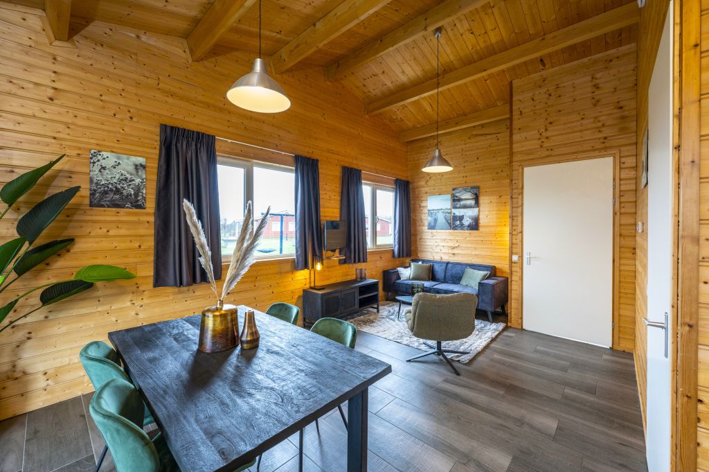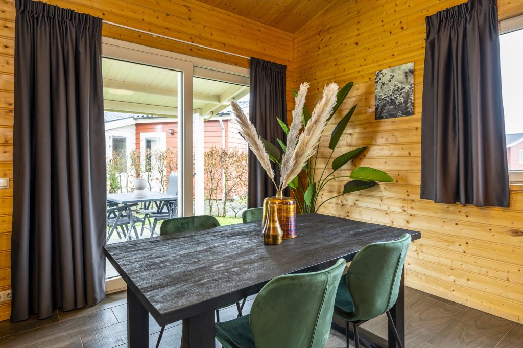 De riante woonkamer heeft een open woon- en eetgedeelte, zodat u altijd in contact bent met uw gasten. Door te kiezen voor het luxe meubelpakket (meerprijs) wordt het huis sfeervol ingericht en dit creëert direct een warme en gezellige uitstraling. Door de combinatie van het extra hoge plafond en de vele grote raampartijen ontstaat een extra ruimtelijk gevoel en het zorgt voor veel lichtinval. Doormiddel van een schuifpui loopt u zo vanuit de woonkamer uw overdekt terras op.